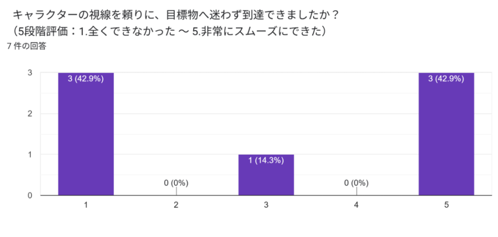 - 課題の露呈(評価1): 4割以上のプレイヤーが「全くできなかった」と回答しており、視線という非言語的なサインだけでは、ガイドとしての手がかりが不足していた可能性が高い。