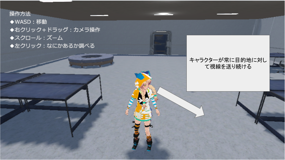- 今回の仕様では視点をユーザーが自由に操作できることから、キャラクターではなくカメラフォーカス先がつねにユーザーの焦点となるため意図した誘導が有効になりえないと感じました。カメラは固定してユーザー操作をさせないつくりのほうがキャラクターのモーションの違いに気付く余地があるかと思います。 また、引きの構図だと物理的にキャラクターの細かいモーションに気付きにくいと思いました。 たしかサイレントヒル2などで近くのアイテムの方向に顔を向けるといった似た仕様があったはず…